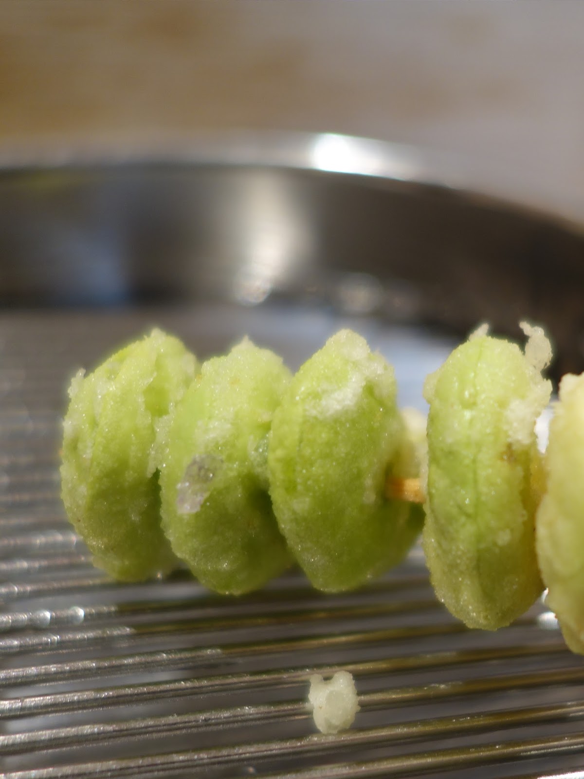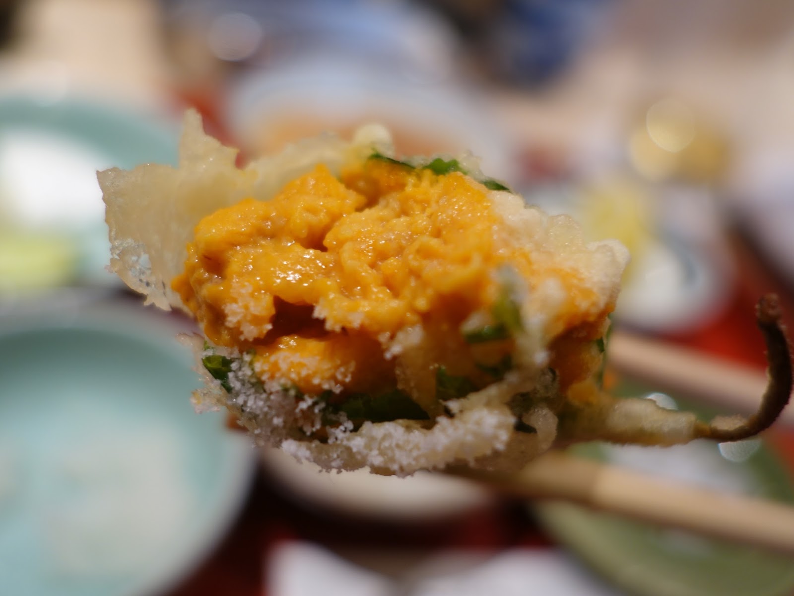 紫蘇葉包著馬糞海膽裹上麵衣後快速入鍋