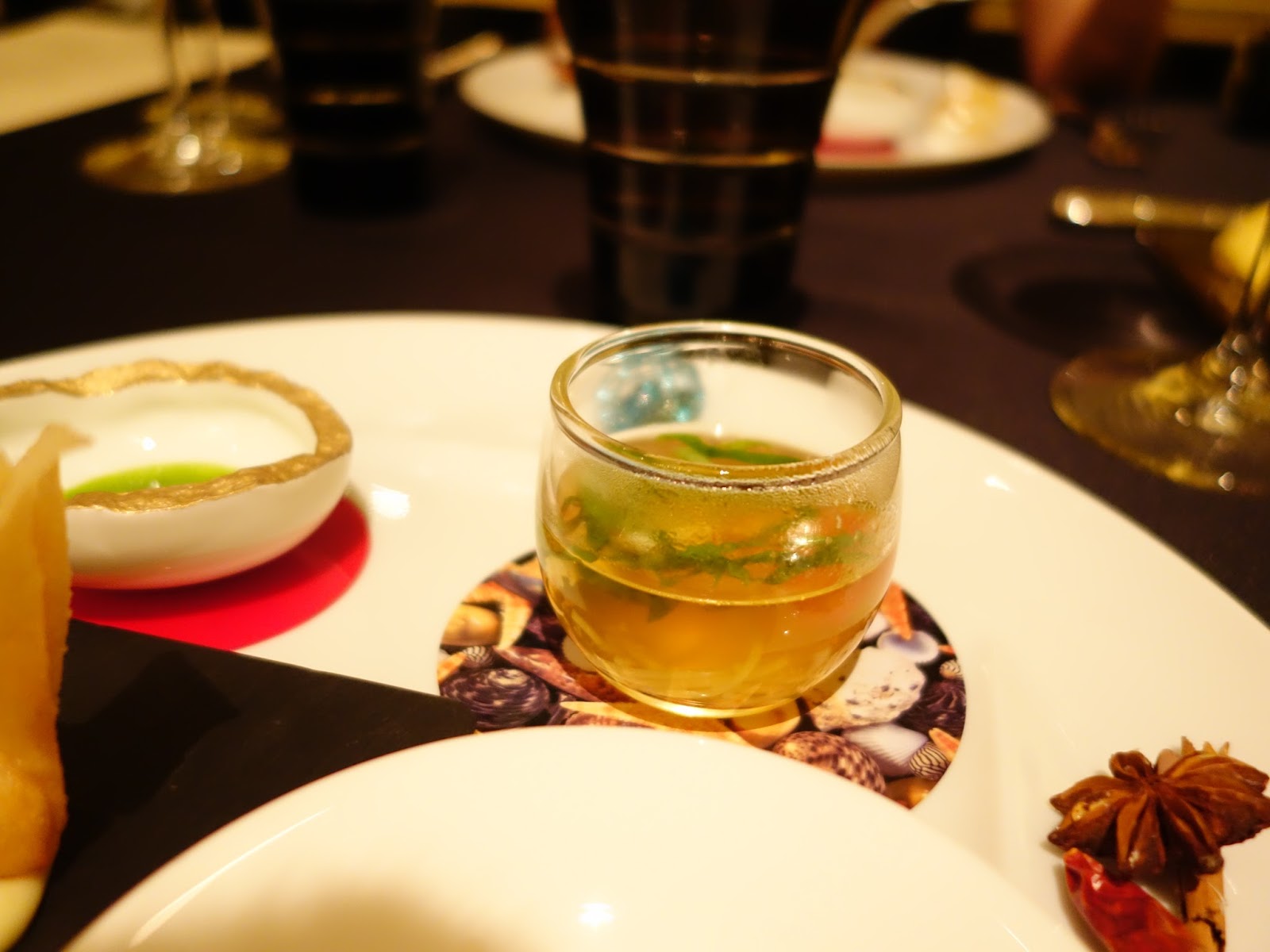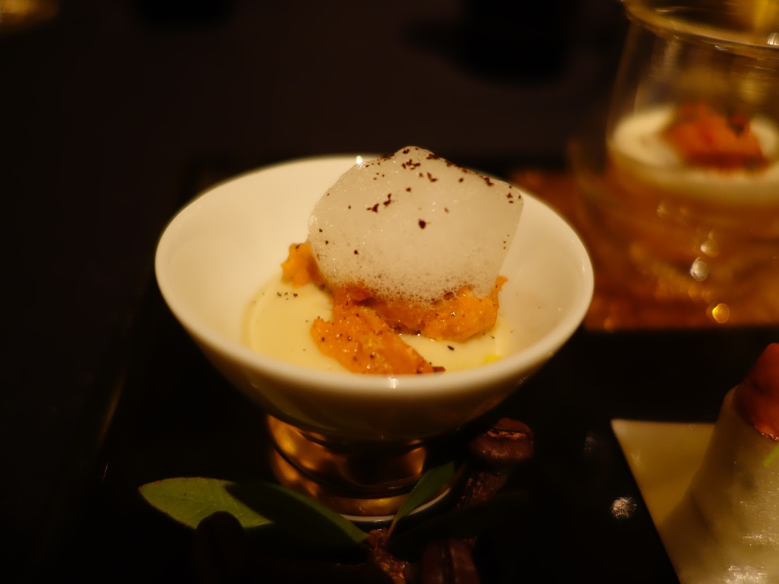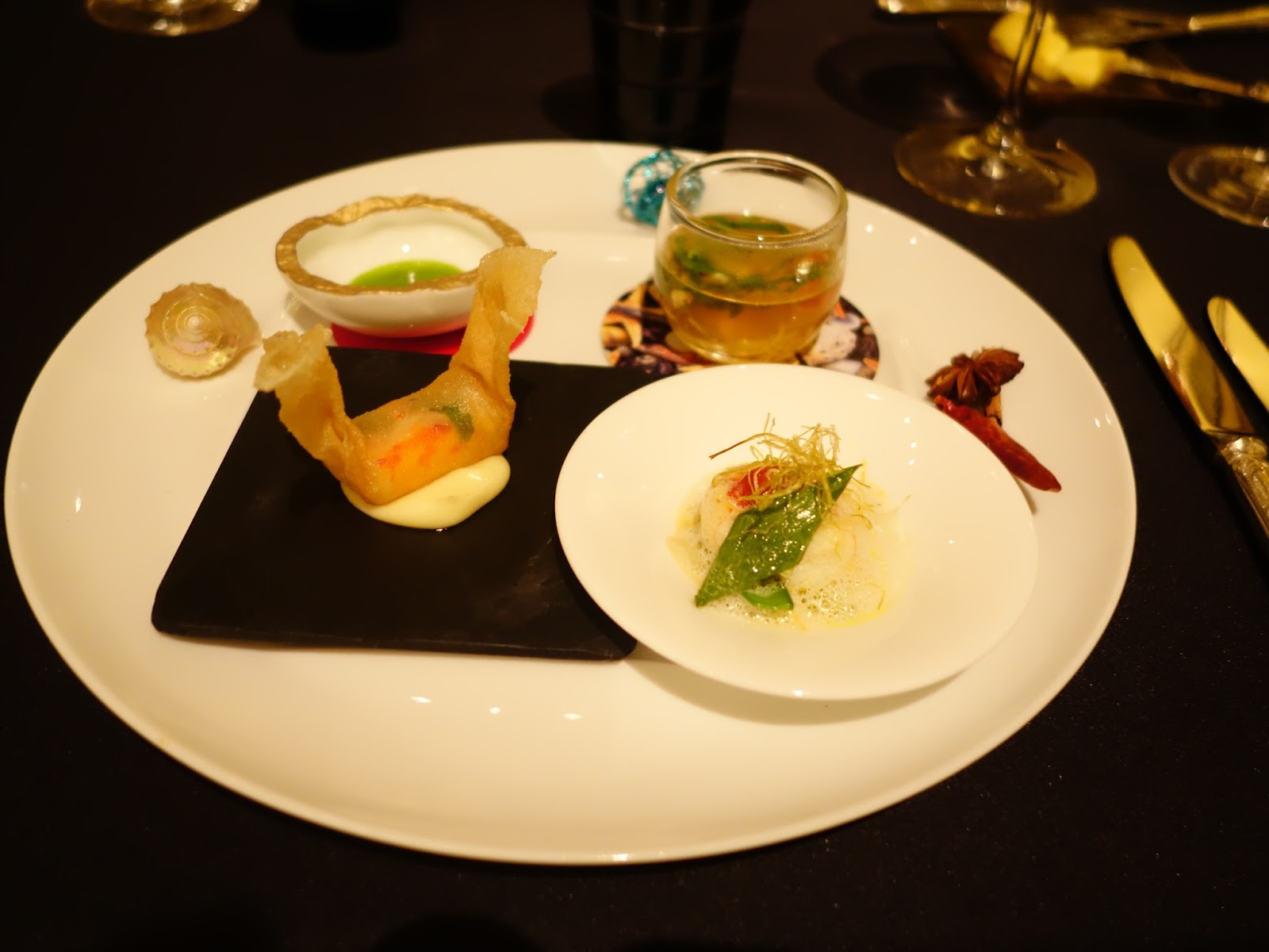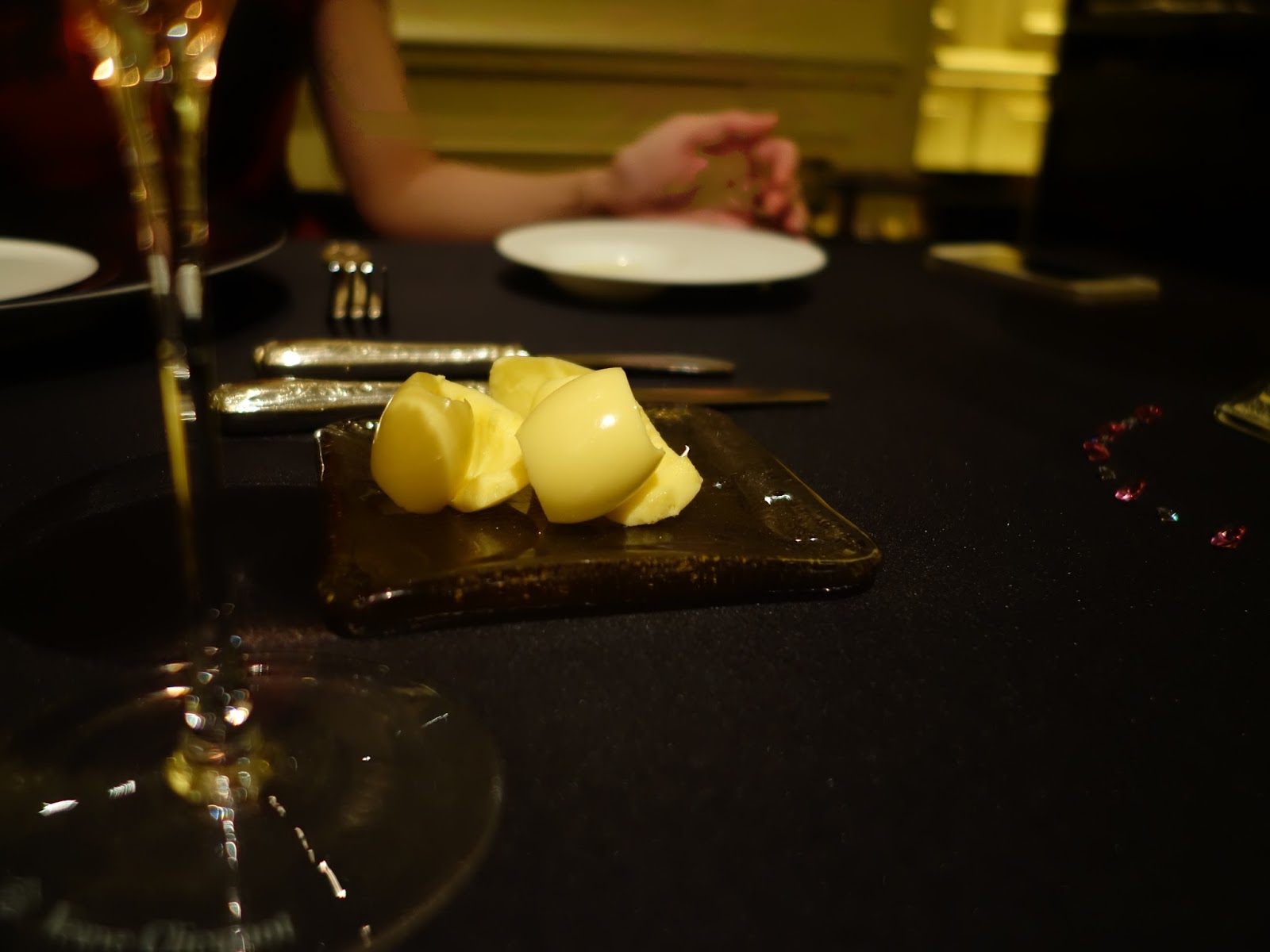 整棟都是Joel Robuchon的餐廳,分為三星的 Joel Robuchon Resturant (2F + 3F包廂)、二星的 La Table (1F)麵包店、酒吧 Rogue Bar (2F),進門時前台會先確認是否需要寄物,同時也確認前來客人的服裝是否合宜,穿著的規定頗嚴,不過這也確保了用餐環境的一致性,個人是滿喜歡對於穿著有要求的餐廳,畢竟這是對一個餐廳的禮貌,也是對其他客人的尊重 (但在台灣穿的正式去用餐好像不普遍,甚至會認為沒必要無聊小題大作)