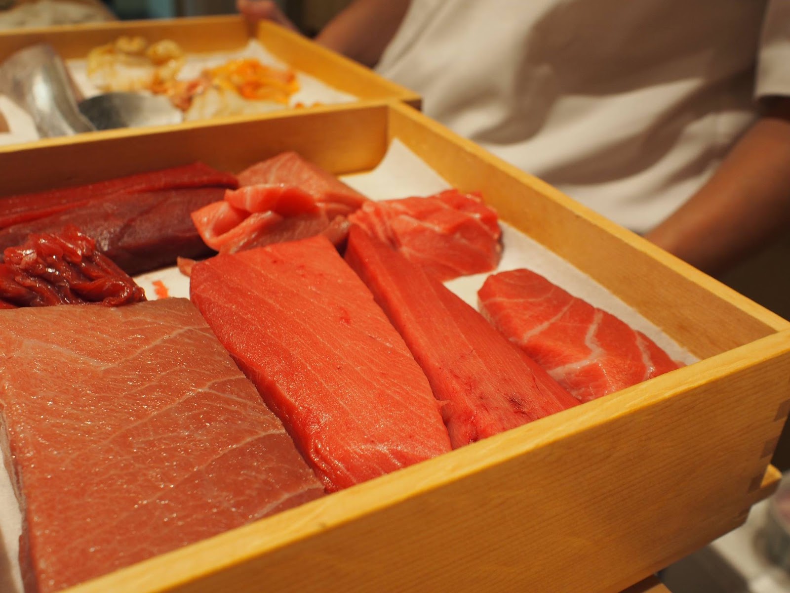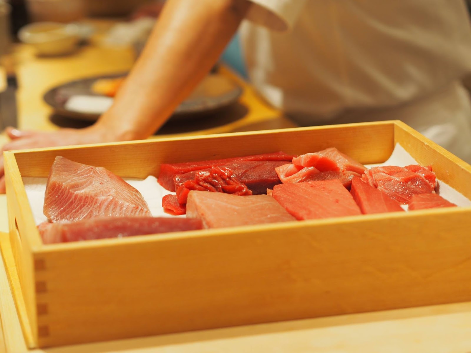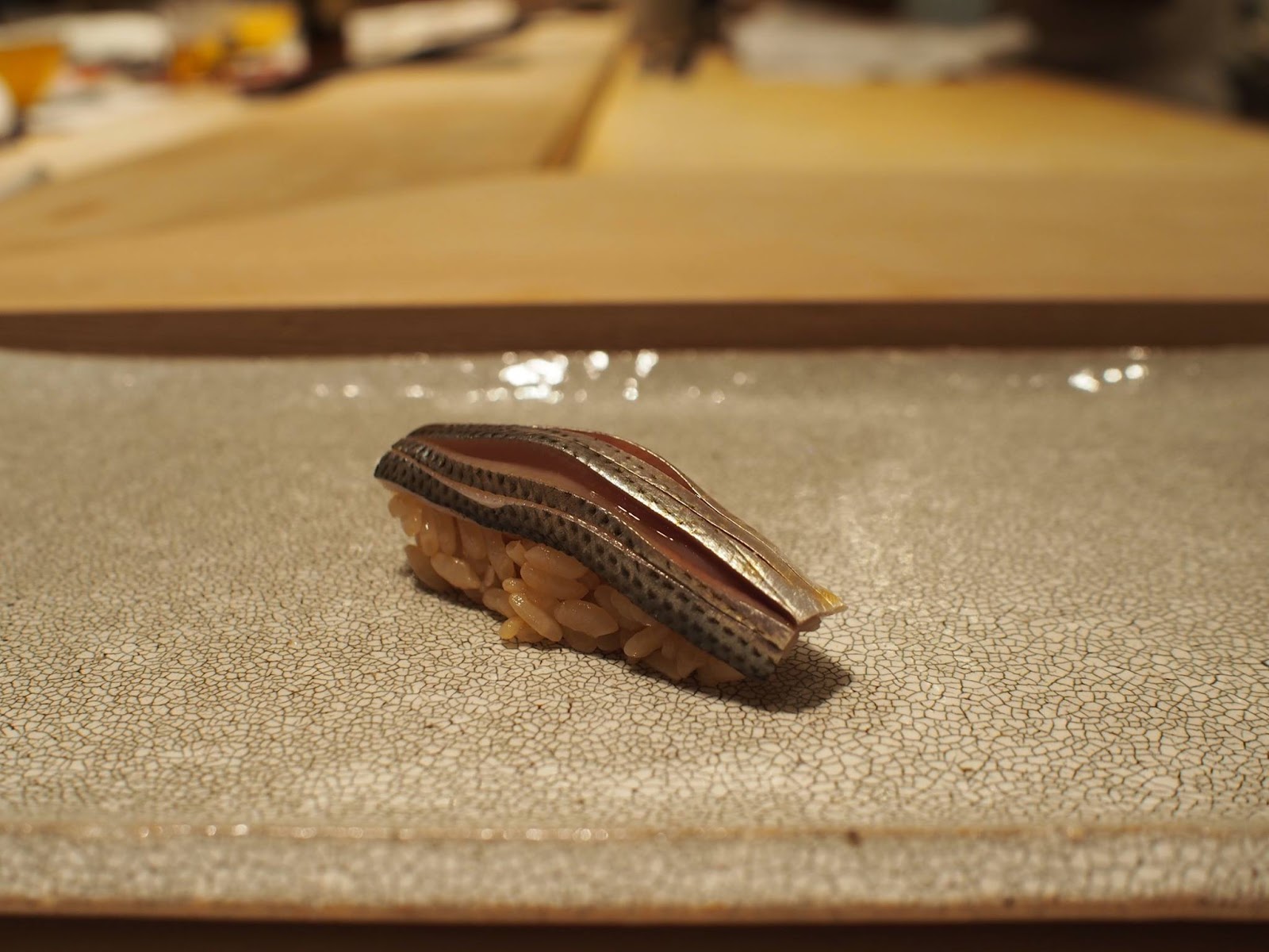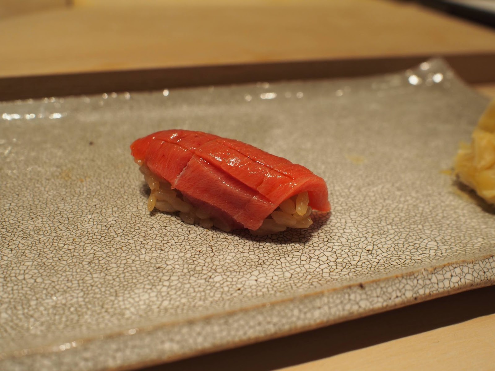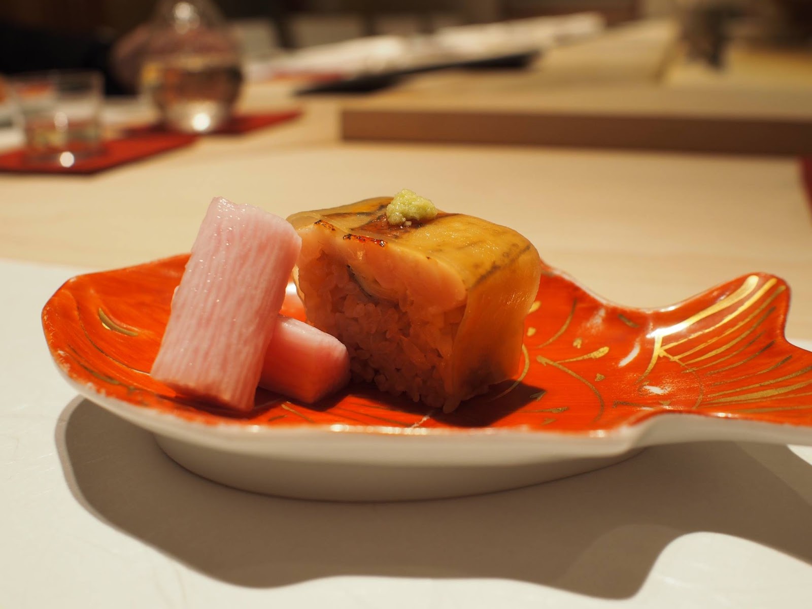 取名鯛良,就是他的金目鯛非常棒,而且是用押壽司的方式呈現,算是店內名物,令人驚奇!!! 一般押壽司都是以青花魚為主,這邊則是使用金目鯛 + 白昆布,充滿豪華感,口味也更細膩、更有深度